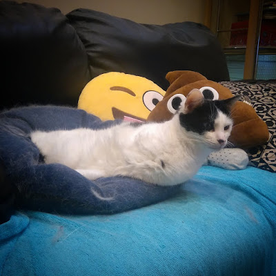 Pushy saa nyt lojua vapaammin missä haluaa, kun sarjakuvaviltti suojaa sohvaa..